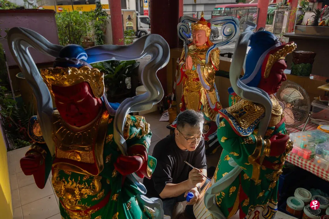 一墙颜料,两张桌案,三四尊神佛像,五六盏花灯笼;在小小的组屋阳台上,杨修权用一双巧手,描摹着信仰与传承。