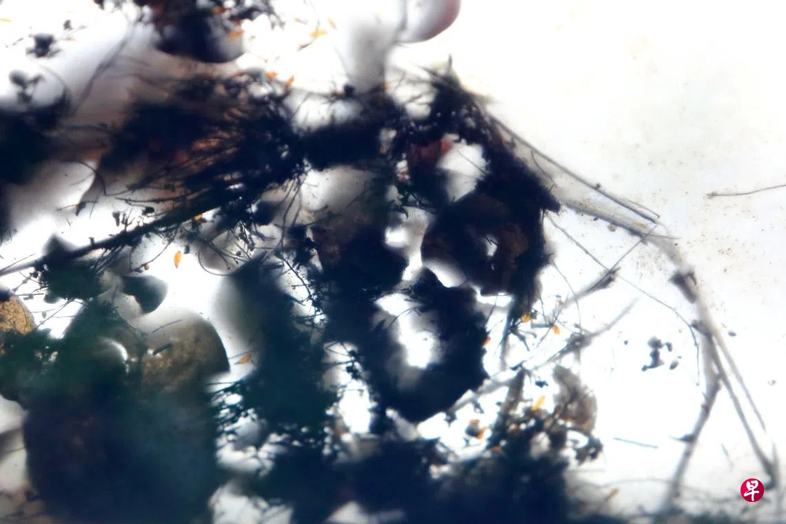 初时是在市区某处公园一座凉亭,偶然发现这幅“画”。凉亭旁边植有几株九重葛,被风一吹,花瓣纷纷飘落。我抬头看落花,却惊讶地发现亭子顶部格栅上,积聚着已经变成棕色或黑色的枯萎花瓣,夹带数片新落的红色花瓣,在光线作用下,透过半透明的亚力克平板,呈现出类似墨色浓淡干湿的变化效果,浑然一幅写意水墨画。