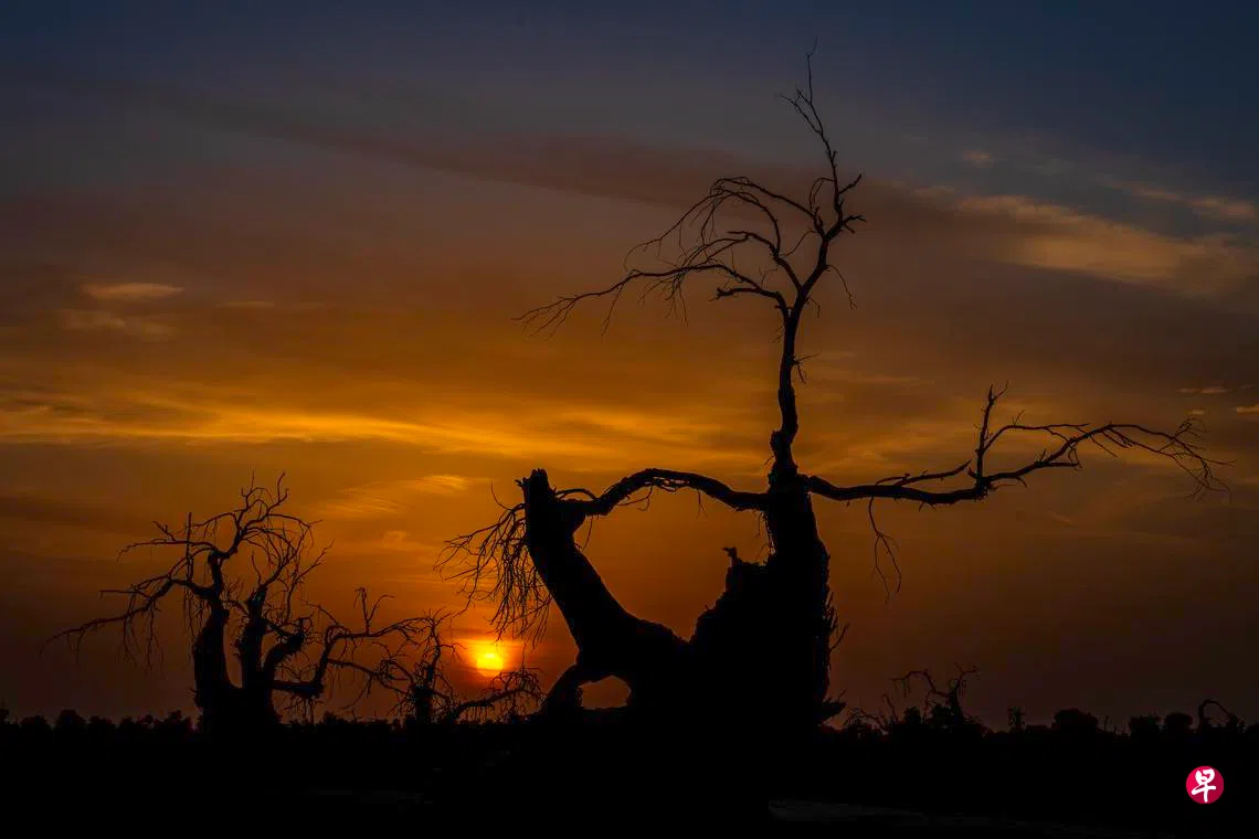 南疆大漠,胡杨树坚韧的生命力是一道独特的自然界奇观。胡杨为大漠而生,亦为大漠而亡。