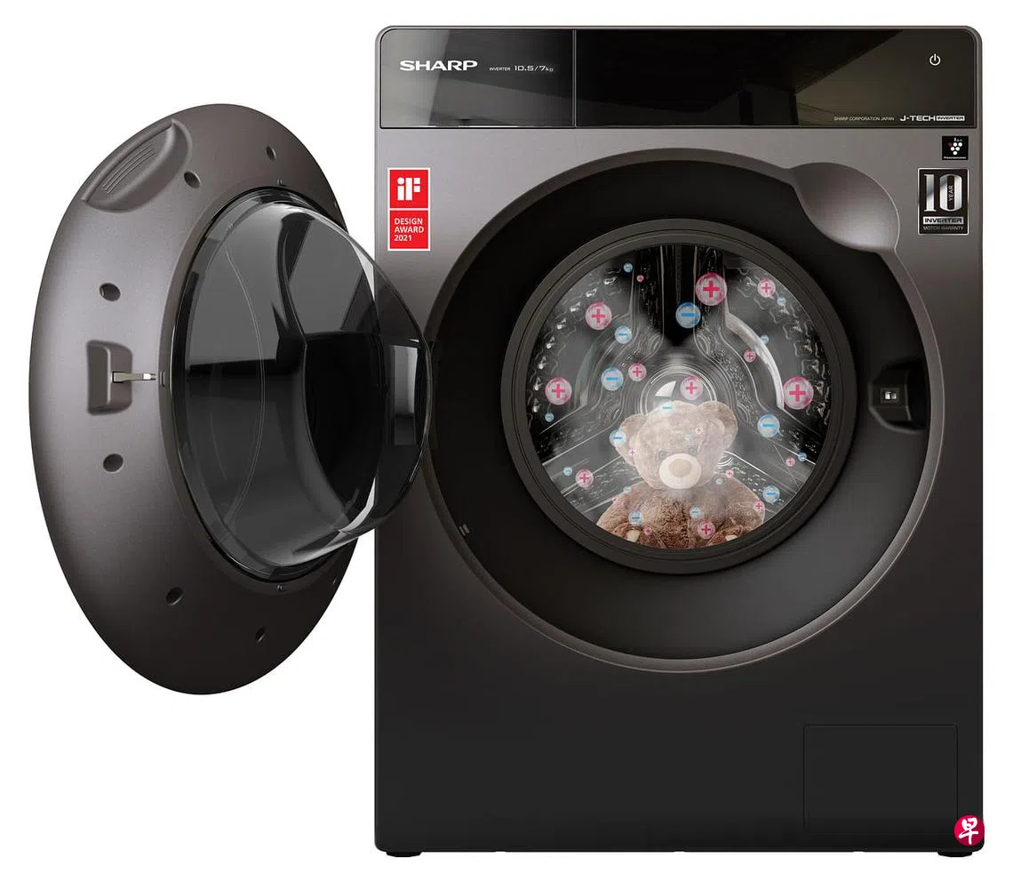 夏普(Sharp)推出前置式二合一洗烘一体洗衣机,搭载自动除菌离子技术,可有效抑制细菌、霉菌和异味。它也能以15种不同程序洗涤和烘干,从棉织物、环保到热风清新烘干和除螨。这台洗衣烘干机独有的热风清新烘干功能,能以离子干洗难以日常清洗的物品,如玩具、帽子等等。此外,其热蒸汽功能通过全面的清洗,可抑制99.9%的过敏原与细菌。