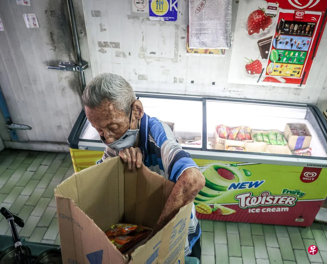 老人家每天早上要到批发商处,选择当天要售卖的雪糕口味和数量,再用报纸将一块块干冰封好,放在泡沫保温箱里,带到森林大厦外的雪糕车摊位售卖。