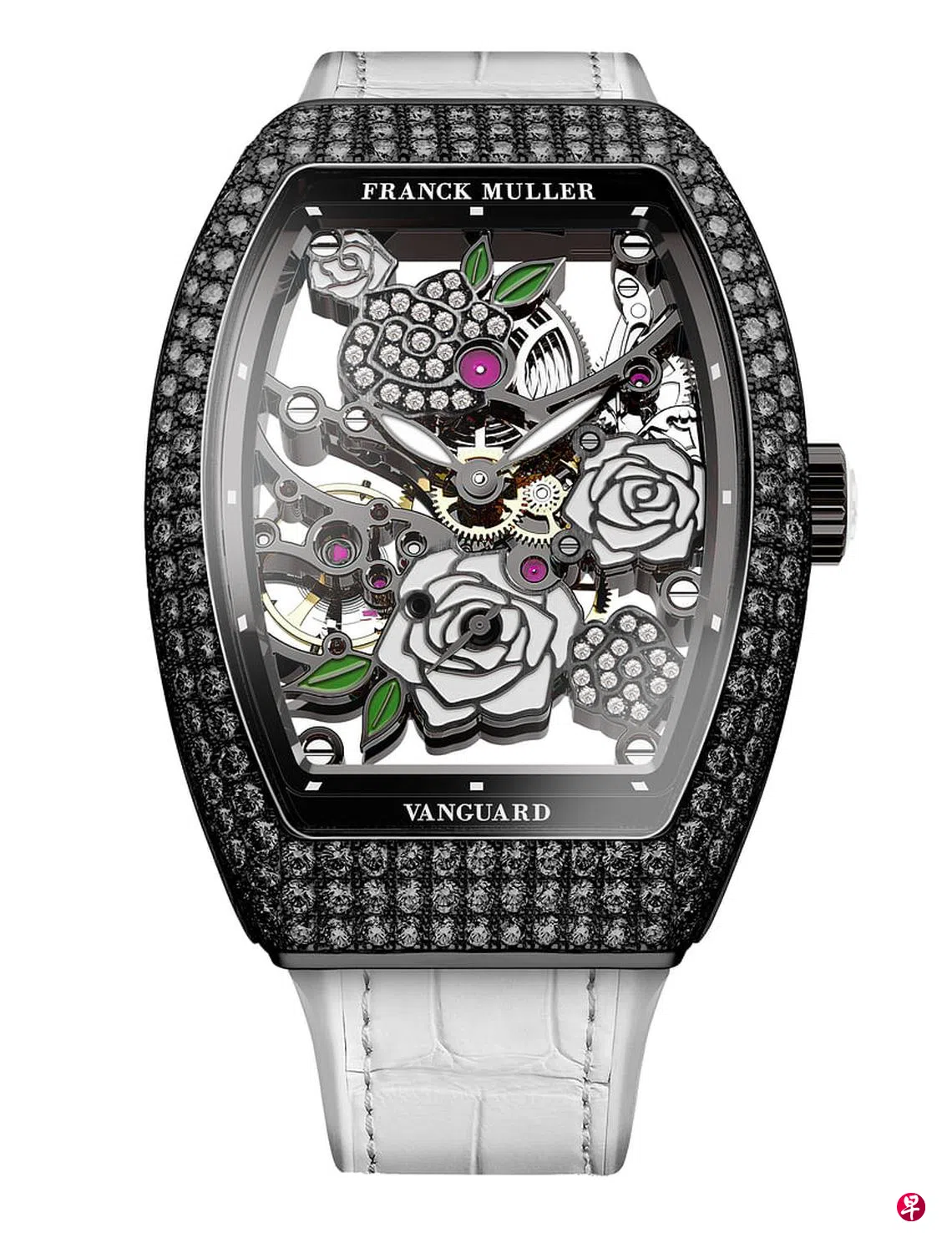 A: 在为太太等法穆兰Vanguard玫瑰镂空黑钻腕表(Franck Muller Vanguard Rose Skeleton Black Diamond),之前已经买到了红色那款,现在等白色的。太太喜欢腕表黑白对比,特别突出黑色宝石镶嵌表壳的诱人之处。等了1个月。