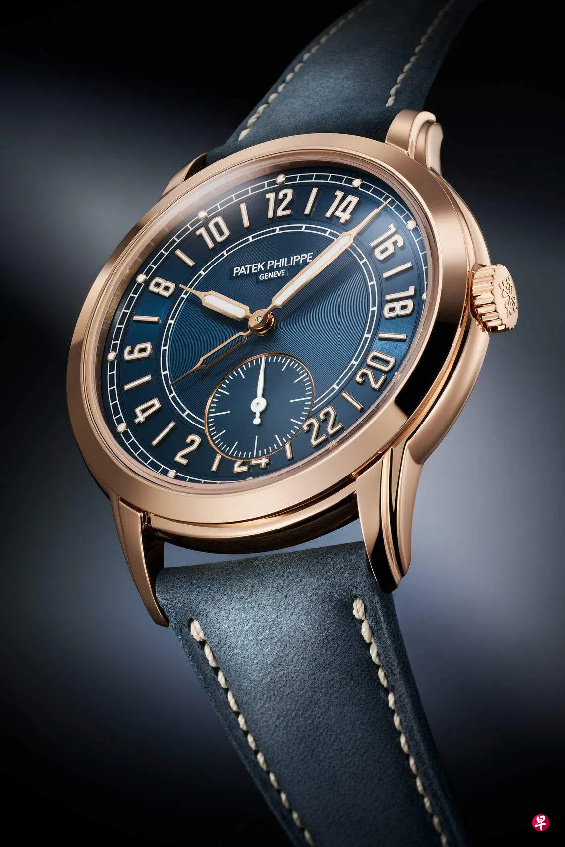 直径42毫米的全拋光玫瑰金表壳灵感源自Calatrava周历腕表Ref. 5212A-001,采用弧形双层表耳,更显与众不同。百达翡丽将原本设于表壳左侧的传统当地时间调校按钮替换为获得专利的调校系统,可将表冠拉出一半,按一小时为单位向前或向后调校时间。