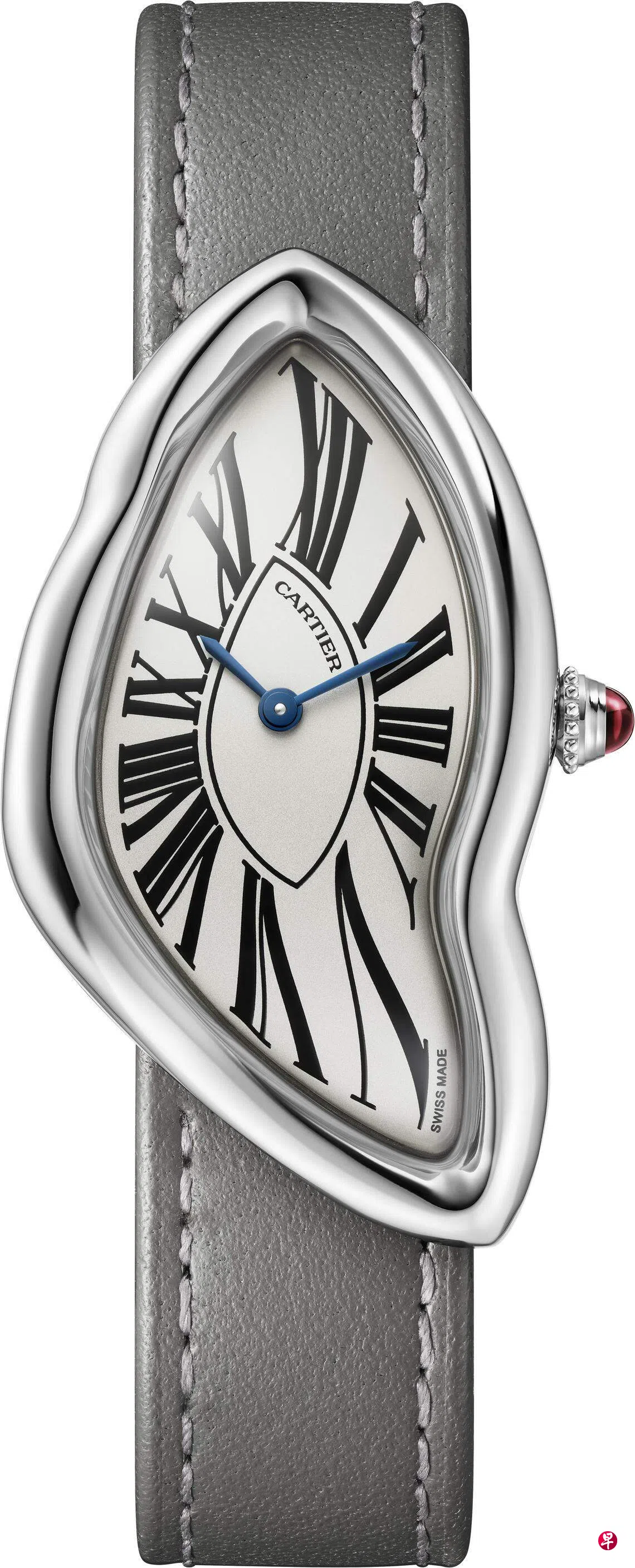 自1967年以来,只有少量的Crash被复刻,2019年Crash黄金复刻版是伦敦新邦德街旗舰店独家产品,一表难求。今年工匠在原创设计基础上进一步探索表壳潜力,推出铂金表壳新款,搭配表盘罗马数字、剑形蓝钢指针,以及镶嵌在串珠表冠中的突圆面红宝石。新作装载手动上弦机械机芯1917MC。新版本7月起在卡地亚伦敦新邦德街旗舰店独家发售。