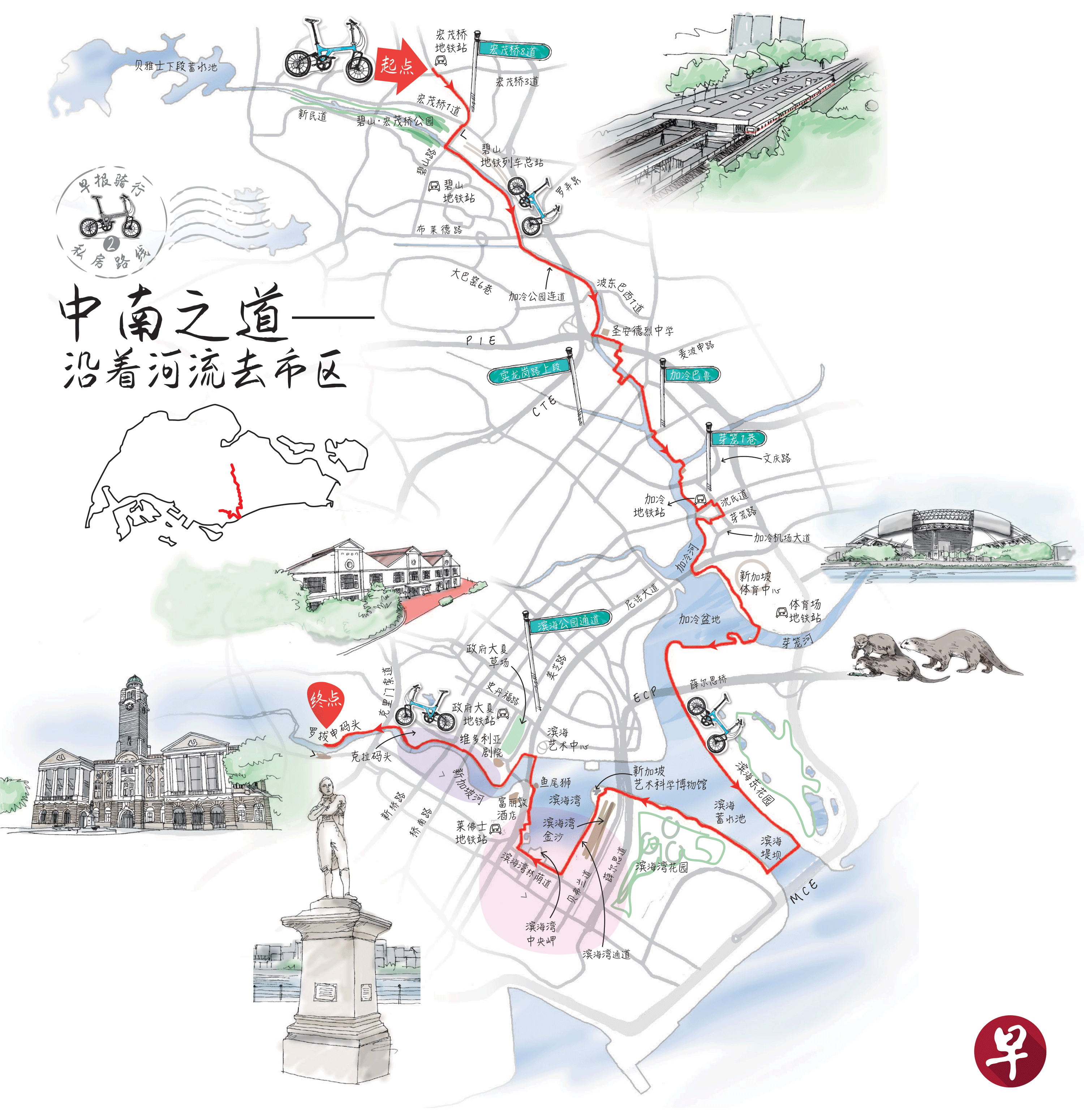 本周我们介绍的早报私房路线,带大家从岛国中部宏茂桥出发,沿着加冷河南下滨海湾,再拐往新加坡河,途经邻里组屋区、工业园、庙宇、滨海堤坝、金融中心、艺术建筑;新加坡的民生、自然、历史、文化,一趟骑行一览无遗。