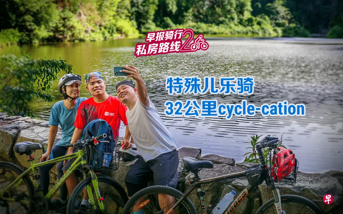 第三集的《早报骑行私房路线2 》,我们找来一组嘉宾陪我们一起骑行。 这一系列所设计的路线,除了是加入了不同主题的住宿元素,更重要的是路线以符合一家大小舒适度为主。 所以我们就请了Ah Bob李欣赏一家三口跟我们一起出发,从新加坡西部一路往北骑行回到我们第二系列的起点——义顺。 Ah Bob李欣赏和太太林慧慧同是我们报馆前同事,现在夫妻俩共同经营The Fat Farmer这家公司,提供摄影和摄像相关服务。 14岁的乐乐(李俊乐)是大家的开心果,主要负责的是吃喝玩乐,还有健康长大。爸妈在生活中利用各种方式机会教育,因为“#我家有个自闭儿”,所以要让他学会生活自理,也是一件不简单的事。 而更不简单的,是慧慧在几年前患上了鼻咽癌,需要接受化疗和电疗。希望、耐心和时间,成了这段日子的奢望。 骑行,成了俊乐学习接受“change is ok”的方式、慧慧锻炼体力的途径、一家人创造美丽回忆的机会。从10公里、20公里慢慢骑行到40公里,这已经不只是路程上的距离,而是三个人人生旅途的完美里程碑。 这一趟约30公里的行程,我们会途径小桂林、克兰芝阵亡战士纪念碑、入住胡姬乡村俱乐部。我们会吃小饼干、吃炒饭、吃奢华大餐、喝milo、打保龄球、游泳等。 我们会像一家人,记录一段平淡但幸福的cycle-cation。