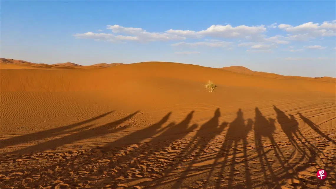 行走在沙漠,经验丰富的骆驼主人都不走重复的路线,这样我们就可欣赏平整的金色沙海,温柔平滑的沙丘,风吹过留下的沙纹,以及沙漠360度无阻挡的壮丽迷人日落。夜晚,同住营区的一群美国得州黑人朋友为同伴庆生,在篝火旁奏乐唱歌跳舞。夜深人静时,满天星星如织网,那么密那么近那么亮,用手机居然还拍到蓝色星球。