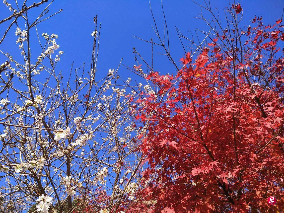 过桥时看见飘落的叶子静静地在香岚溪上漂动,褪了色的秋叶带着几分凄美,此景让我想起关汉卿的“秋景堪题,红叶满山溪”,红叶入画入诗后成了永恒,再不褪色。香岚溪旁的红叶林就像徐徐摊开的长画卷展现在我们眼前,让我们这些难得见到红叶的人满心欢喜。