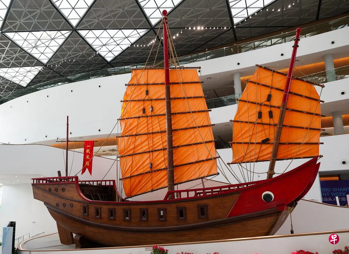 步入中央大厅,一艘两层楼高的红头船以熟悉的身姿闯入眼帘。大气磅礴的展览中心分三层展示潮汕历史和民俗文化。缤纷多彩的嵌瓷,工艺精湛的木雕,有四大名绣美誉的粤秀,灵动多姿的澄海风筝,一件件展品令人刮目之余不得不赞叹潮汕历史与文化之醇厚。