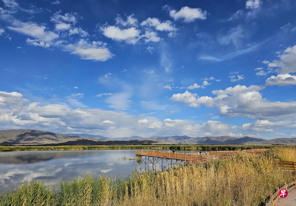 第二天导游就要我们见识新疆之大,用过早餐,行车北上500多公里,7小时后才用午餐,傍晚5点多才掀开北疆游的序幕,抵达可可苏里。导游说那只是个小公园,可是一踏入园区就令人惊艳。远山连绵起伏,蔚蓝的天空,美得非笔墨所能形容,碧绿的湖水倒映着朵朵白云。可可苏里湖海拔1333米,平均水深约2米。它是由多期地震断陷形成的盆地积水而成的湖泊,是一处天然沼泽湿地。湖中有大小浮岛20多个,春秋季节吸引不少稀有鸟类来栖息繁衍后代。沿着湖上的长木桥欣赏美景之后,越过马路步上木板栈道登山,远眺湖景。