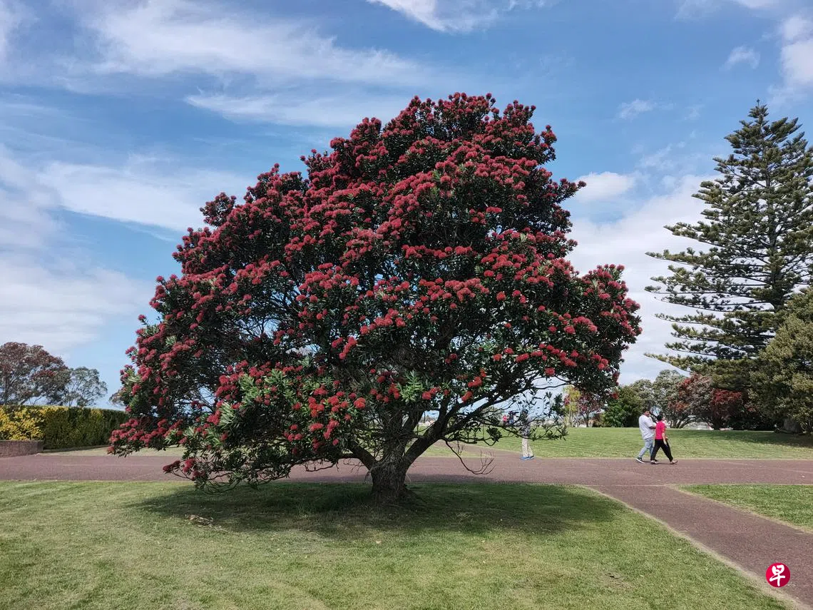 我们从奥克兰启程,正值夏天,这里的花花树树把新西兰装扮成美丽的天地。首先映入眼帘的是新西兰圣诞树(Pohutukawa)。这种树属于大乔木,树干粗大,树身很高,树冠覆盖的面积范围很广,浓密的枝叶给新西兰炎热的夏天带来无限的阴凉。开花时,整个树冠都被红色的花朵覆盖,十分耀眼夺目,美丽迷人,公园、街道、住家庭院,到处可见。