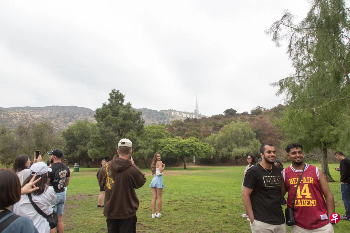 第一站我们到了好莱坞的地标附近——好莱坞湖公园(Lake Hollywood Park)。这个公园可以近距离看到好莱坞标志,是拍照打卡的好地方。它位于一个安静的高尚住宅区,需要穿过一些狭窄山路,两辆车对面驶来得互相谦让。靠近公园的停车位可说是一位难求。公园草地宽广,有很多当地人带着毛小孩在这里玩耍。对我们游客而言,这里有看到好莱坞标志的最佳视野。