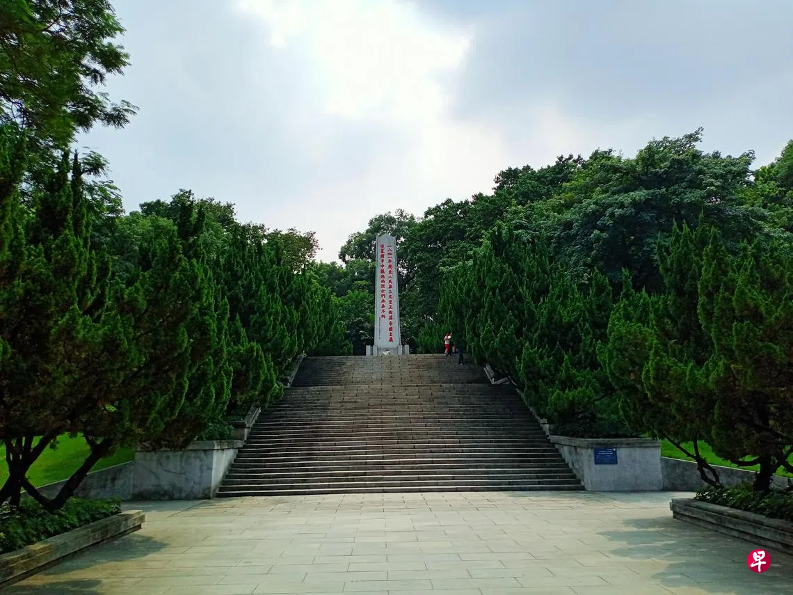 元生带我先去了三元里纪念公园。公园坐落在三元里大道35号,全名为“广州市三元里抗英斗争纪念公园”。纪念公园的主题建筑是一座8.5米高的纪念碑,碑体正面竖直镌刻着两行红色醒目的大字:“一八四一年广东人民在三元里反对英帝国主义/侵略斗争中牺牲的烈士们永垂不朽”。