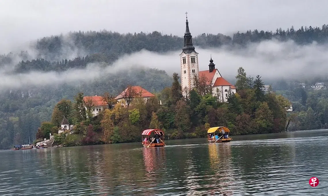 一大早,我们一组团员在布莱德湖公园的码头,登上覆着遮篷的传统手划木船。木船慢悠悠地朝湖中央的布莱德岛方向前进。此时云雾缭绕,映入眼帘的仿佛是一幅仙境般的画卷,让人顿时心悦神怡。