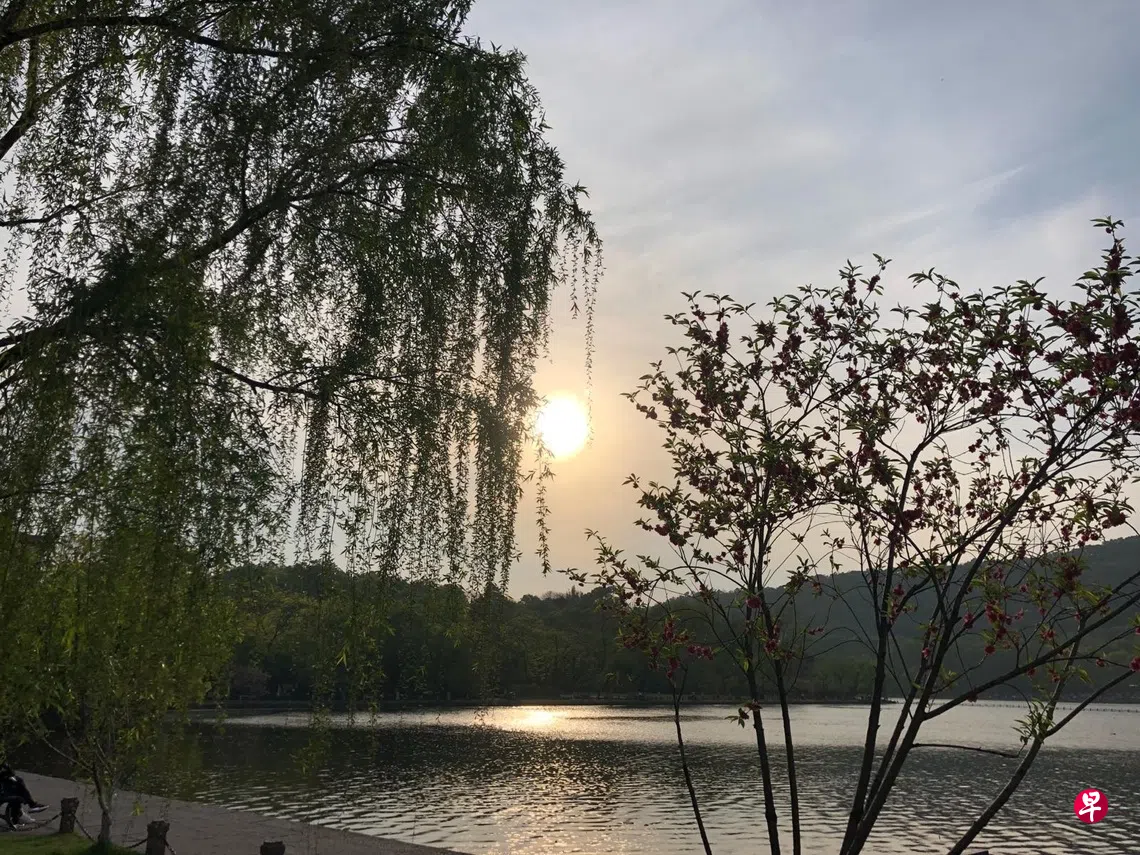 西湖虽不大,但各处景致不同。从苏堤南侧进入,满眼皆是桃红柳绿。若要描绘出那般美丽,非亲眼所见不能知其妙处,真有“一想之美”。沿游廊走进一园中,但见鱼翔浅底,不远处正是乾隆皇帝御笔亲题的“花港观鱼”石碑。再走进去,眼前顿时豁然开朗,西湖美景尽收眼底:垂柳依依,桃之夭夭,桥映湖中,鸟鸣啁啾,好一番“苏堤春晓”。随后,于湖畔登上摇橹船,泛舟湖心,遥望远处的“雷峰夕照”与吴山上的城隍阁。