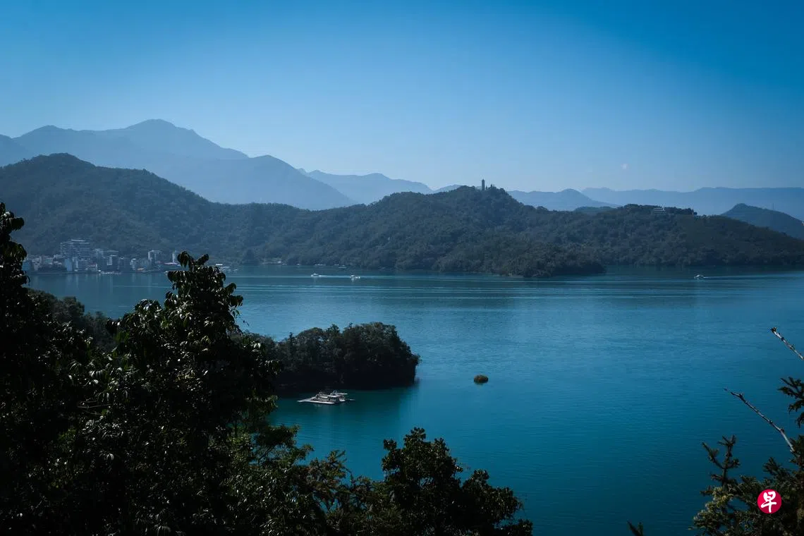 日月潭是台湾最大的淡水湖,湖泊被拉鲁岛一分为二,东侧形如太阳,西侧宛若月牙,因此得名“日月潭”。日月潭像一块由群山簇拥着的绿宝石,看着它,我不禁想起了杭州的西湖,有山、有水、有寺、有塔,乃风水宝地也。