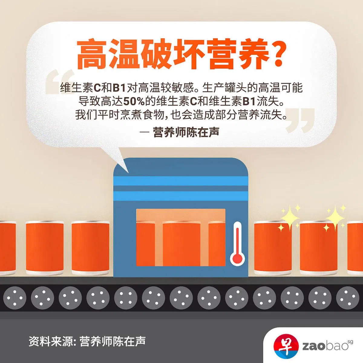 罐头食品的保存期长,因此被视为不新鲜。其实相对的,生鲜食品不一定就营养满满。淡马锡理工学院应用营养学与升糖指数研究专业领域主任芭丝卡兰(Kalpana Bhaskaran)博士早前接受《联合早报》访问时指出:“新鲜食材往往是在完全成熟前就采摘收成,所以一开始就没有包含全额营养素。何况,新鲜食材的营养成分也会随着时间流逝而流失。”