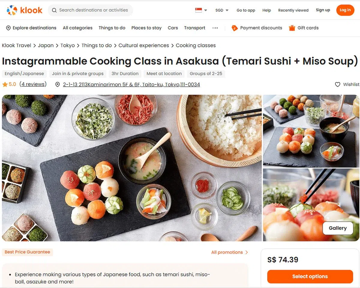 IG打卡料理课 | Instagrammable Cooking Class in Asakusa 地址: 2-1-13 Kaminarimon 5F & 6F, Taito-ku, Tokyo,111-0034 价格:$74.39/人(最少需俩人开课) 课程时段:9:00 / 16:00,建议提前上Klook预约