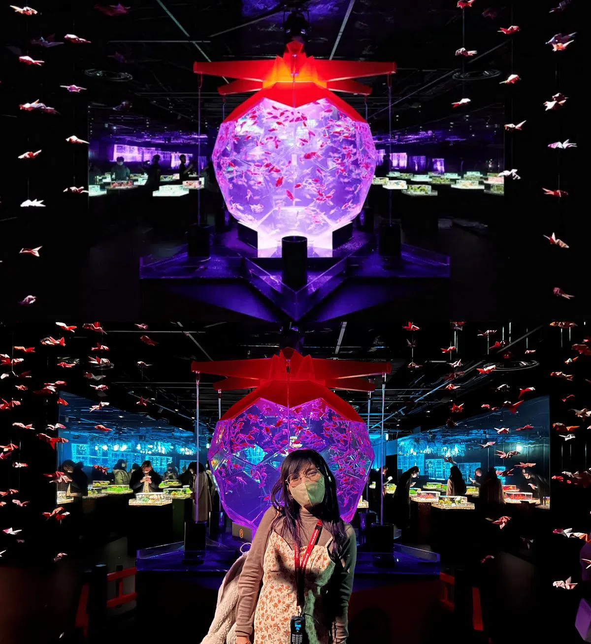 日式古典音乐、搭配七彩霓虹灯光、伴随着哗哗的流水声,以及摇头晃脑摆动着的可爱金鱼,形成一种视觉享宴,让即便不是特别喜欢鱼的你都会感到很震撼。