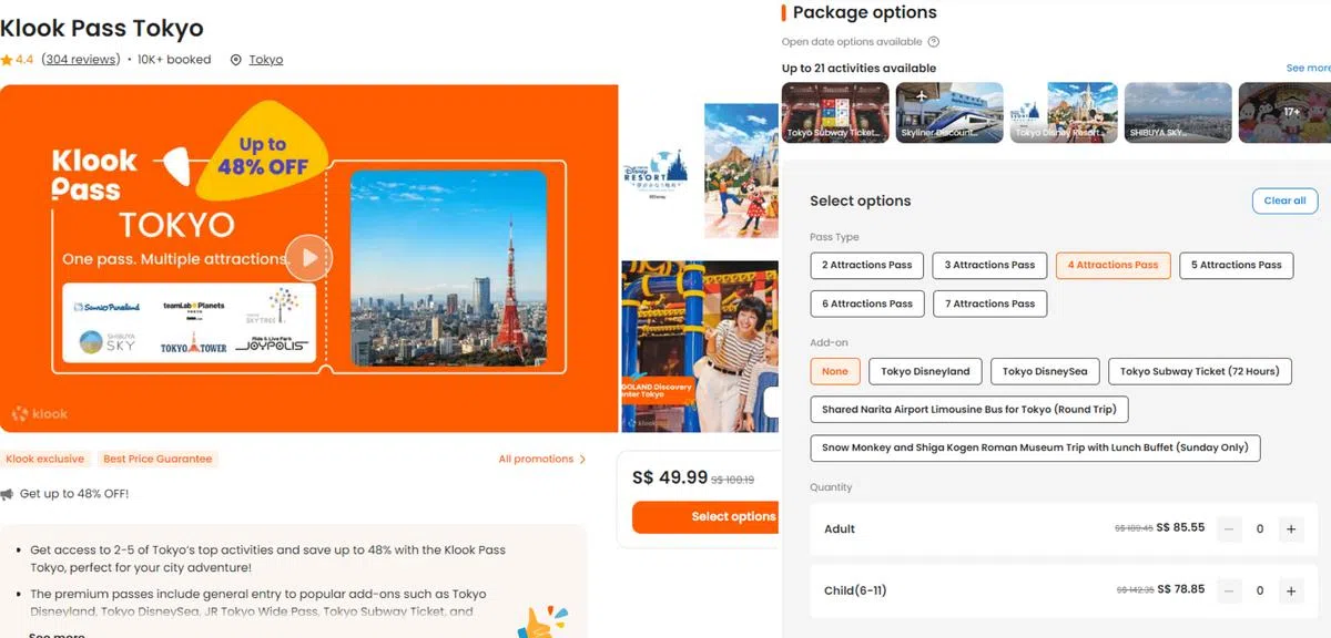 如果你打算到东京游玩,Klook东京Pass可以让你节省高达48%的入场费用。该配套横跨21个不同类型的东京旅游景点,你只需选择想参观的景点数量,点击购买,之后再到App内确定每个景点的日期及时段即可。