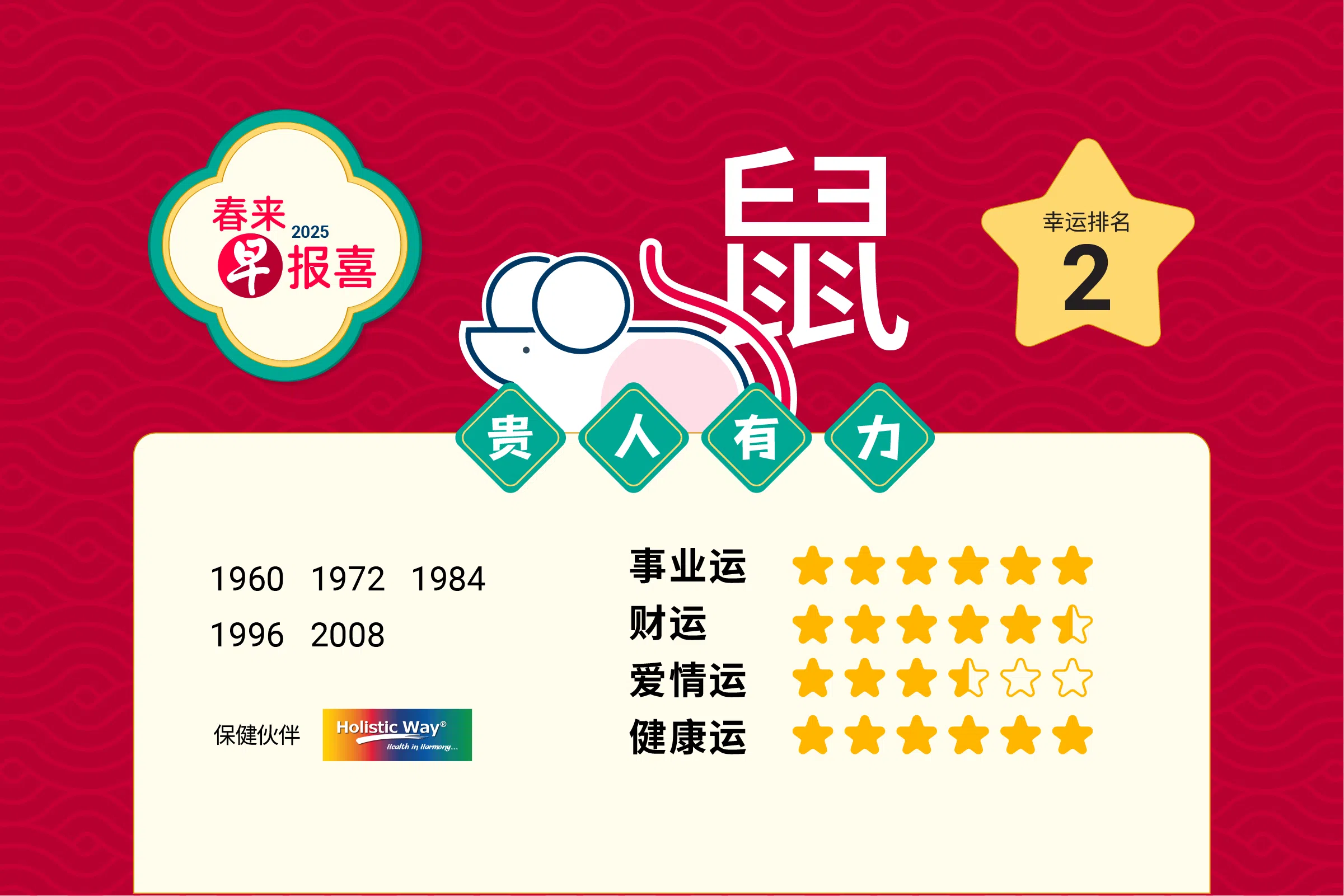 肖鼠的朋友去年和太岁相合, 而今年又与太岁暗合,所以运势还是相当畅顺。再加上今年命宫中有众多强而有力的贵人吉星汇集在命宫中,所以运势将大幅度彪升,不论是事业、财运、爱情或健康等都会有不错的表现。