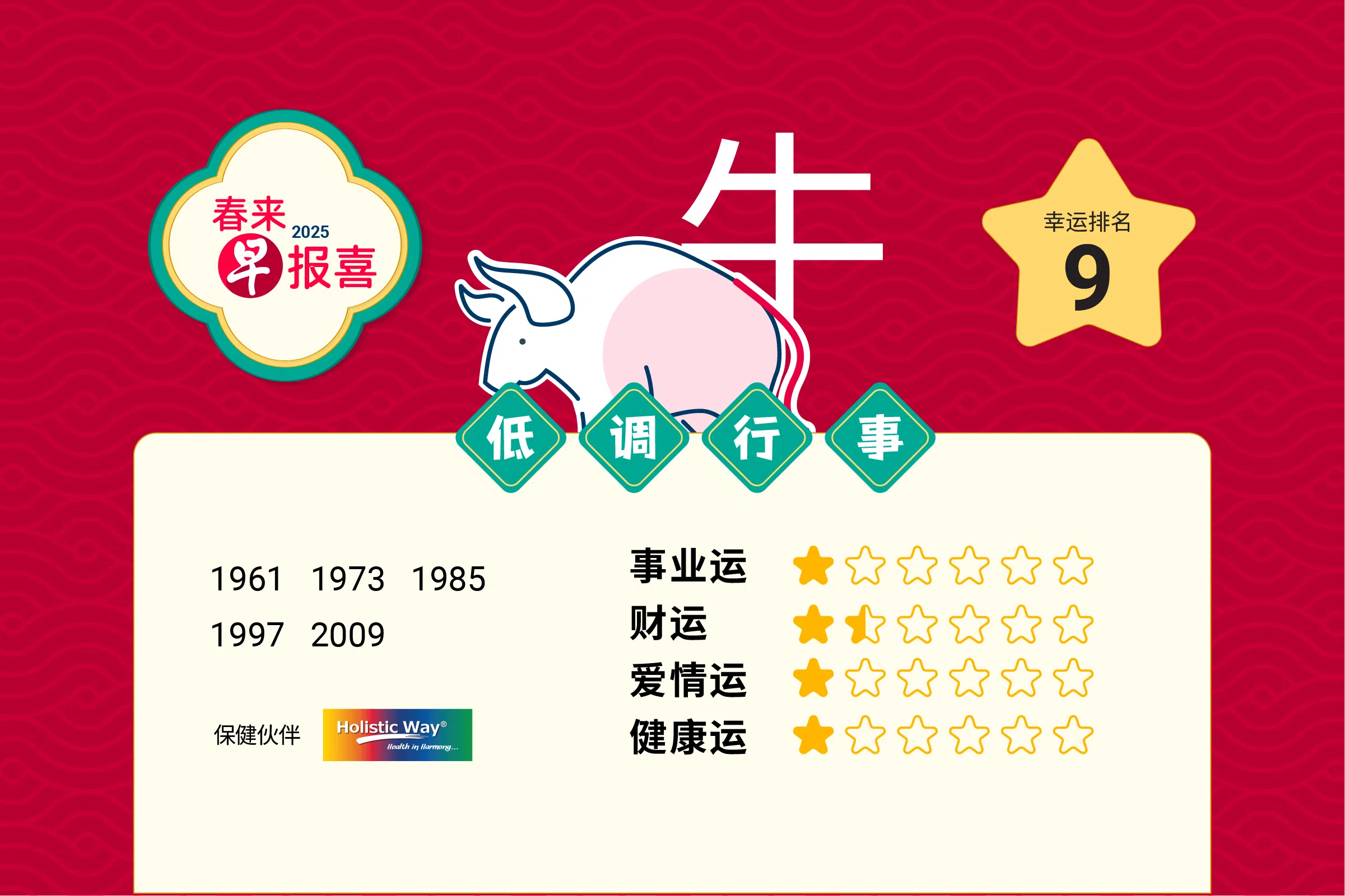 肖牛的朋友今年虽然为太岁三合年,表示人缘相当不错,不过运气却不如往年般通顺。肖牛朋友今年的流年运程波动甚大,再加上今年命宫中有众多凶星汇集,只有一颗小吉星守护,所以遇到困难时,都必须靠自己个人力量去解决,若不提高警惕来应付突变,很可能临时手足无措而溃不成军。
