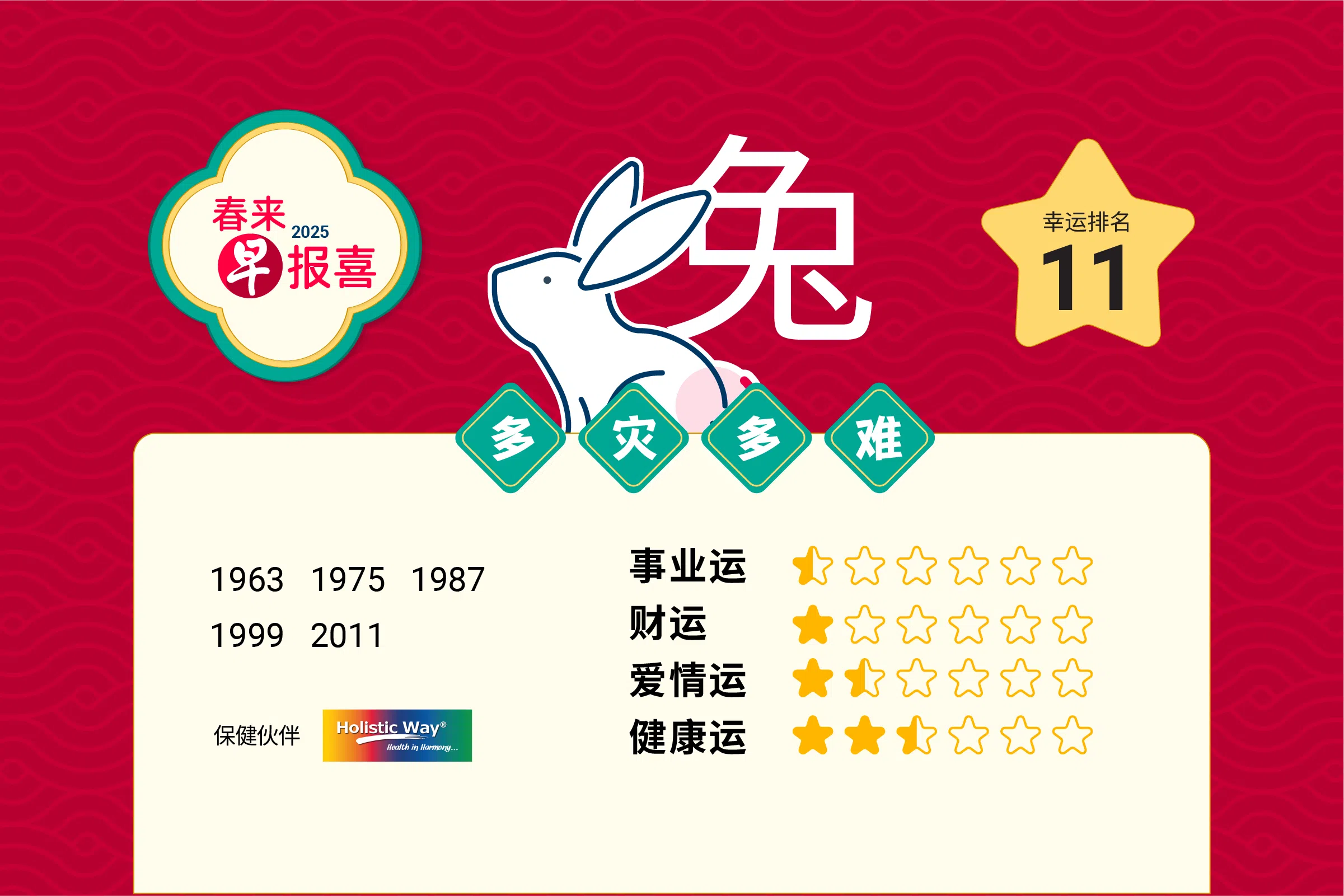 肖兔的朋友今年流年虽然没有与“太岁” 刑冲破害,但由于命宫中有诸多凶星混杂,而又无吉星化解,因此不论在事业、财运、感情和健康方面,都必须要讲求个人的实力,并没有侥幸可言。若要从逆境中创出一条生路,除了要加倍努力之外,并且要懂得变通,必须要努力主动地去发掘机会,积极地去广阔工作网络,否则今年便难望有成。