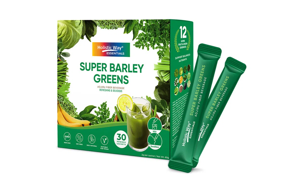 Holistic Way Essentials 超级大麦青汁富含12种超级水果和绿色精华,高纤维配方能帮助自然净化身体、保持碱性,支持消化健康、体重管理及血糖平衡,有助于提升免疫力与整体健康。