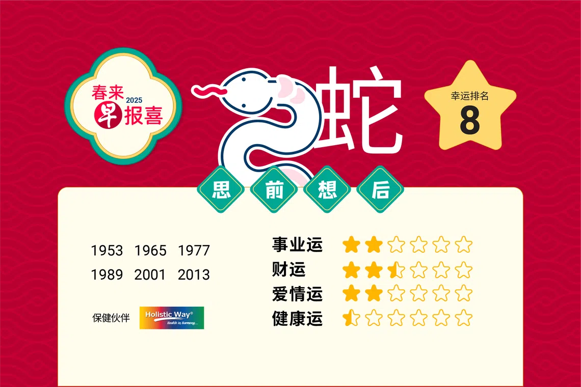 肖蛇的朋友在去年可说是一个大跃进的吉年,不过一踏入蛇年,就必须要居安思危,因为肖蛇的您今年为值太岁年,同时又与太岁相刑,心绪一般容易受到干扰,往往会在情绪不稳定的情况下,做出不当的决定进而影响2025年的运程。虽然今年命宫中有众多凶星汇集,幸好还有化煞星的照耀,若能沉着应变,努力不懈,有望可使任何灾祸消灭,亦可算是平安是福。