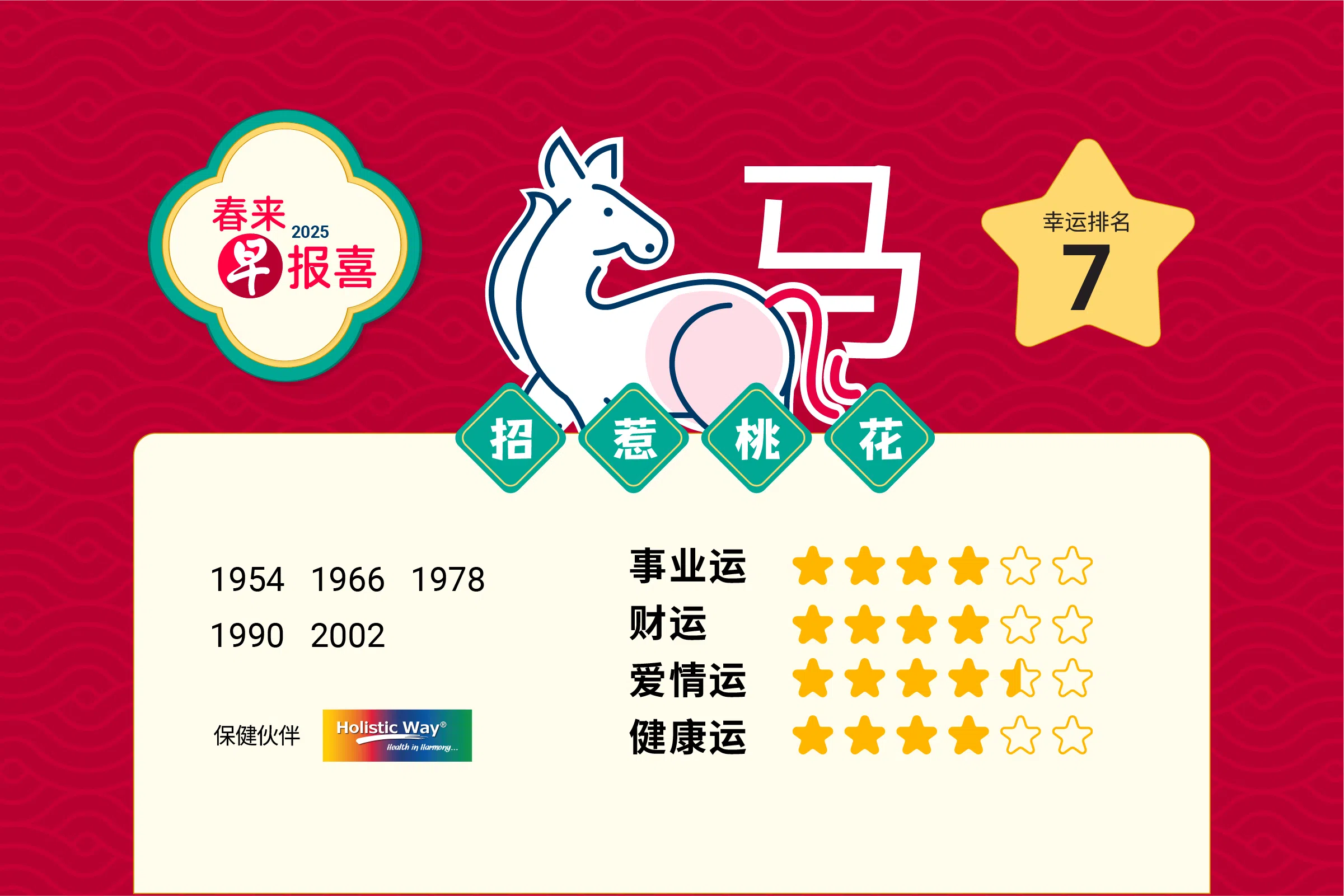肖马的朋友去年度过了一个中规中矩的年份后,今年因为有贵人星的出现,运程会有渐渐好转的迹象。今年在事业上特别容易得到男性贵人扶助,有助于扫除不少阴霾,令前途出现曙光,只要把握机会,事业有望得心应手,扶摇直上。 事业运虽然有望提升,但还是存有变数,事业发展往往节外生枝,若不小心全力以赴,很可能功败垂成,特别要小心是非和权力被夺,避免惹上意想不到的麻烦!