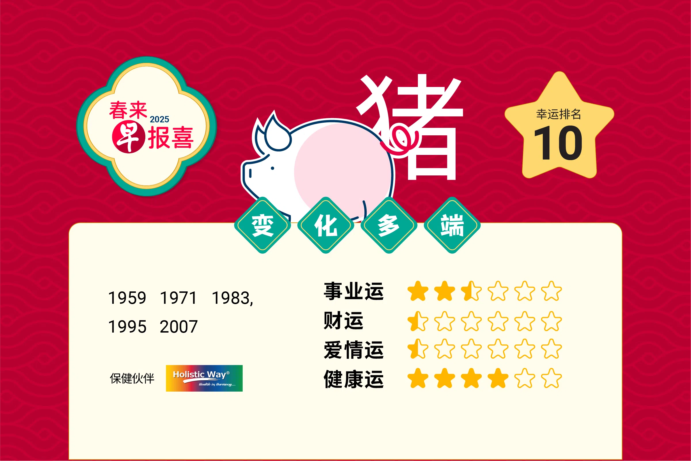 健康方面今年要小心出入,出门远行时也必须要小心留神,以免乐极生悲!此外,今年也要多加关注父母或长辈的健康状况,一旦发现有什么毛病, 就必须带他们立刻就医。由于今年也是肖猪朋友的驿马年,容易有迁移,外出变化之象。 驿马也代表有机会往外地发展事业或今年经常有机会旅游,或者只是去较远的地方,不一定有重大变化。