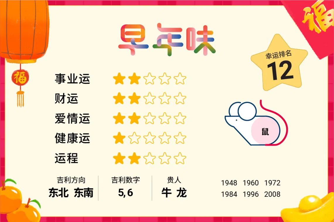 属鼠者今年运势受挫,面临多重挑战,尤其在财务、情绪和人际关系上容易出现波动。在这考验之年,需要更多的耐心和理智,保持沉着应对。然而不必过于担忧,吉星会在关键时刻帮助你。保持积极心态,稳扎稳打,就能在困境中成长。