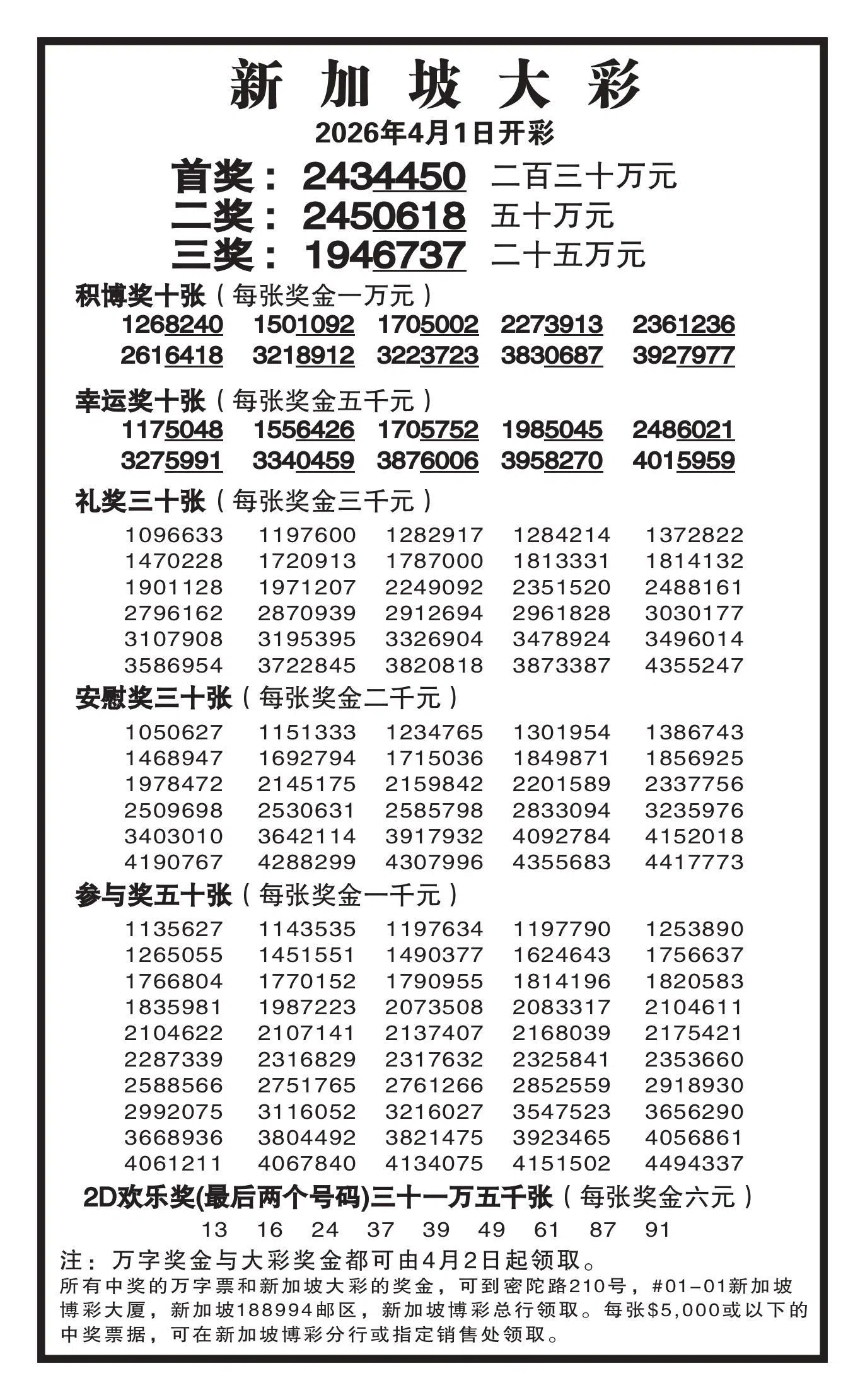 新加坡4D万字票开彩结果 4月1日(星期三)