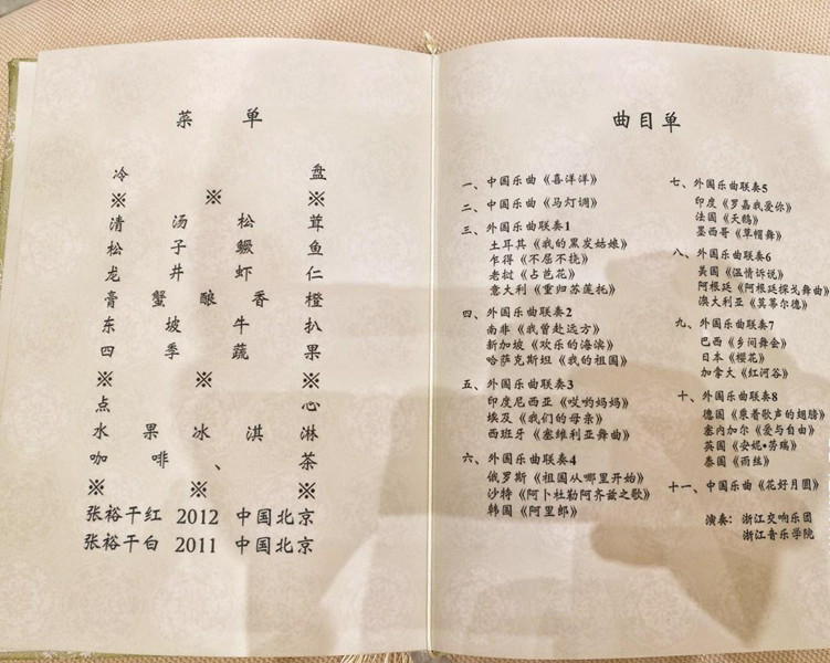 菜单被印制在丝绸上,共有七道菜和四道甜品。