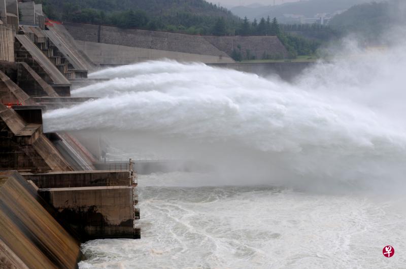 黄河小浪底水库和西霞院水库前天联合调度,按2800立方米每秒流量防洪预泄,巨大水流喷涌而出。(新华社)