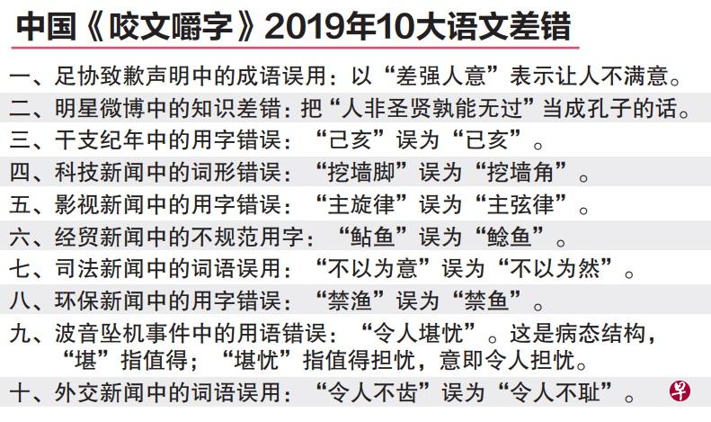 (北京/上海综合讯)中国语言文字规范类刊物《咬文嚼字》杂志社公布本年度10大语文差错,被列为榜首的是足协上个月输球后在致歉声明中的成语误用。足协当时误将“差强人意”用来表达“让人不满意”的意思,其实,这个成语是指“大体上还让人满意”。