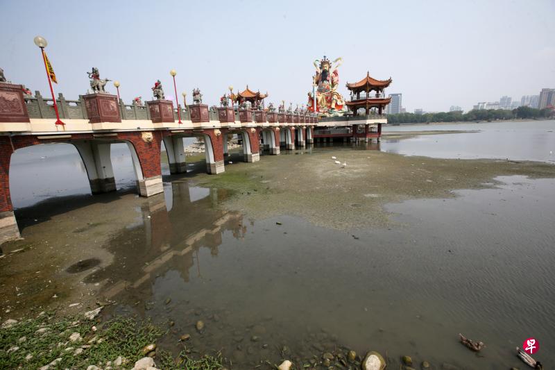 台莲池潭干涸见底台湾中南部久旱不雨,高雄左营著名观光胜地莲池潭龙虎塔与北极玄天上帝附近的浅滩干涸见底,露出底泥,不但有些鱼儿、贝类都已晒毙,湖底只见庙方饲养的鸭鹅到处觅食。莲池潭的水源,主要是依赖半屏山流下来的地表水,而由于长久不下雨,水源枯竭,水位一直下降。(香港中通社)