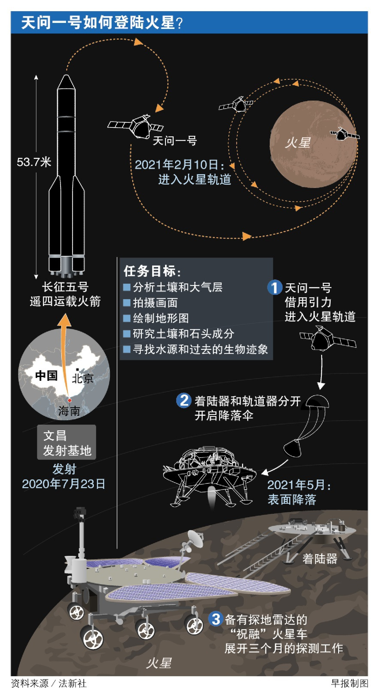 天问一号载送的火星车祝融号预计将在火星进行三个月的表面探测,天问一号环绕器将为火星表面探测和地球的通信担当中继卫星、传送信号。火星车工作结束后,环绕器还将进行长达两年的深度探测工作。