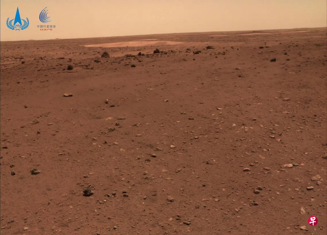 中国国家航天局昨天在北京公布了由祝融号火星车拍摄的着陆点全景、火星地形地貌、“中国印迹”和“着巡合影”等影像图。