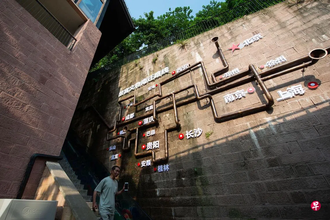 位于重庆市南滨路慈云老街1号安达森洋行旧址片区的重庆故宫文物南迁纪念馆前天正式开馆,占地约2500平方米,以图文、影像、实物相结合形式(右图),呈现中国抗日战争期间故宫博物院组织的文物保护行动。为避战火,数千箱故宫文物1933年从北京迁至上海,四年后又兵分三路转移至重庆和四川。其中,重庆南岸安达森洋行因为仓库面积空间大,水运交通便利,且瑞典是二战期间的中立国,其商民资产不易被日军轰炸,共有3694箱故宫文物秘密存放在此。战后,故宫文物迁至南京,直至国共内战爆发,一批精心挑选的文物再迁往台湾,现仍保存于台北故宫博物院。上图为重庆故宫文物南迁纪念馆外墙展示的文物南迁路线。(中新社)