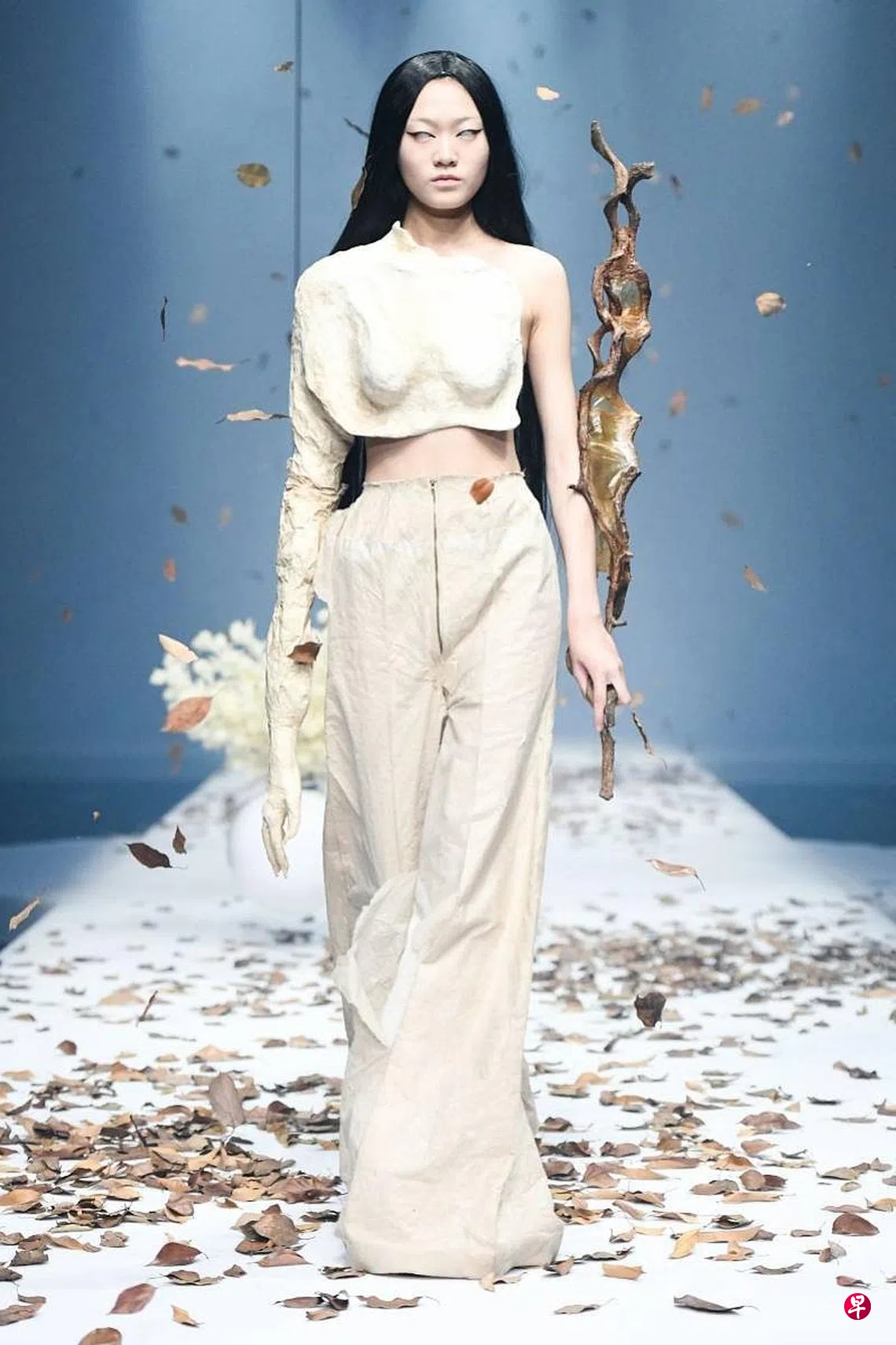 根据校方微博公众号形容,这场上月20日举办的发布会上,作品从“历史文化底蕴中寻找灵感”。在会上走秀的模特儿均以“眯眯眼”造型出场,画上了拉长眼型的眼妆,搭配淡眉和突出高颧骨的造型。