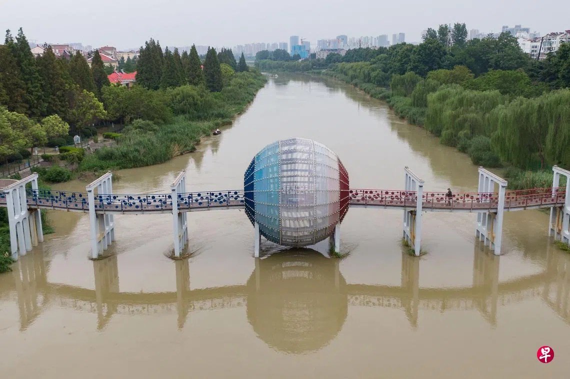 中国南北地理分界线标志园位于江苏省淮安市古淮河两岸,其中标志雕塑“红桥”利用淮安历史遗存老桥墩进行修建,桥当中的地球状标志物正好位于河道中心线位置,球体由南往北按暖冷色调过渡,桥面也由此分为红蓝两色,寓意地球上的南北气候特征。行人可从球中穿过,感受跨越南北气候带的感观变化。(中新社)