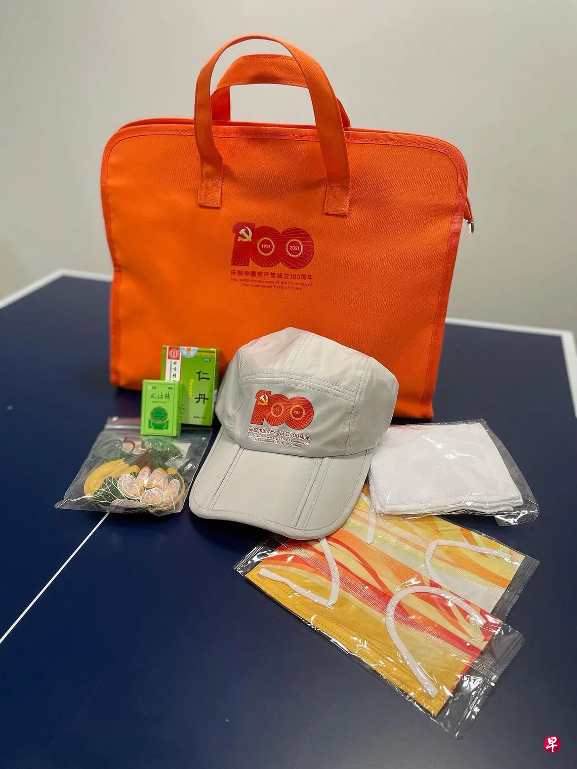 此次大会在炎炎夏季举行,为确保与会者的安全,主办方准备了免费的纪念礼包,放置在与会者座位上。印上建党百年标志的手提礼包中,装有避暑香囊、风油精、遮阳帽、毛巾、特别设计口罩、雨衣和饮品;里头也有温馨提示卡,提醒与会者在大会期间注意健康。