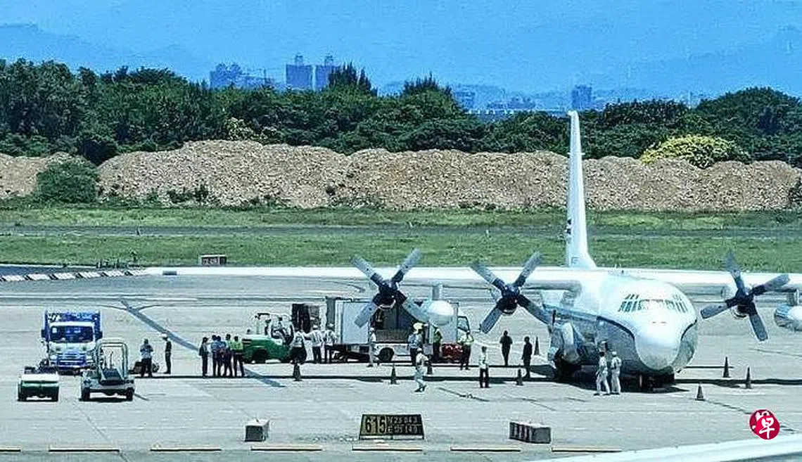 昨天中午12时14分,由美国空军运输机C-130转为民用版的“任务专机”,从菲律宾马尼拉机场降落在桃园国际机场。地勤人员先卸下装在木箱的外交邮袋,再把由红色帆布装载的外交邮袋送上军机。军机添油后,在下午1时20分起飞离开。