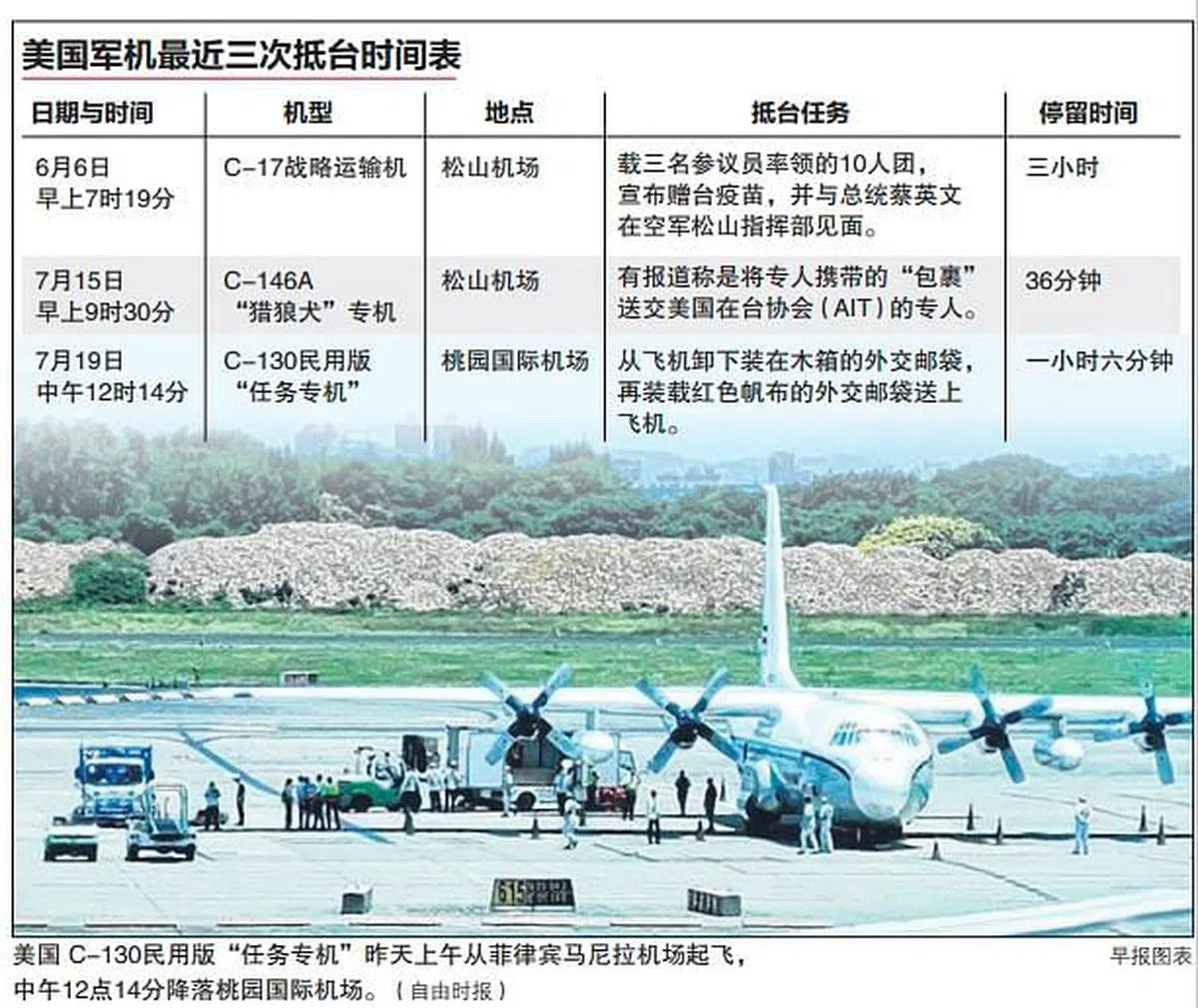 美国军机44天内三度“快闪”降陆台湾,昨天是执行外交送件任务。在中国大陆解放军刚在台海周边展开两周军演、中美首脑与高官近期可能会面的背景下,陆美台的三角军事与外交互动高度引人关注。