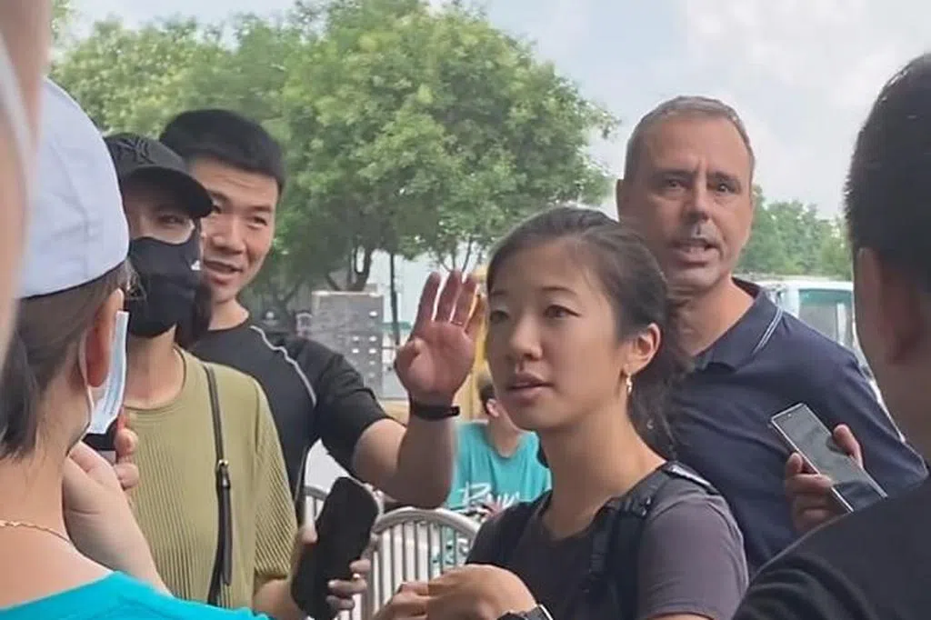 双方僵持好一阵,最后在一名戴黑口罩的女子,以及同在现场的美国《洛杉矶时报》驻京记者苏奕安的翻译沟通下,冲突总算平息下来。
