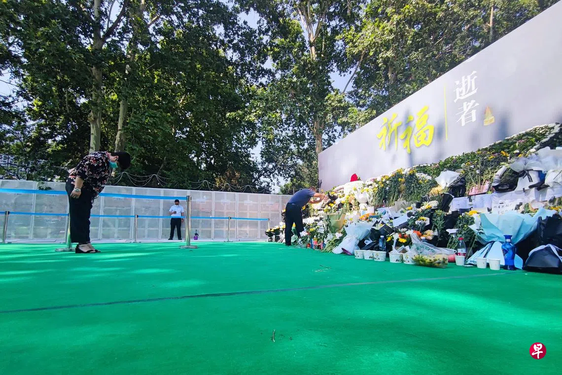 中国郑州地铁5号线沙口路站上周一在暴雨洪灾中被积水冲入,14人不幸遇难。本月26日是地铁事故遇难者的“头七”,郑州民众纷纷到沙口路站B1出口献花和卡片祭奠亡者,但工作者人员用黄色围挡将市民送来的鲜花围了起来,引起市民不满。于是,后到的市民就将献花放在了围挡外,而且数量越来越多。有遇难者家属公开指责,郑州地铁在事故中负有不可推卸的责任,包括防汛不到位,部分地铁线路已进水,5号线却继续正常运营,没有及时疏散乘客逃生等。当局昨天在郑州地铁5号线沙口路站设立追思处,为民众祭奠罹难者提供便利。(中新社)