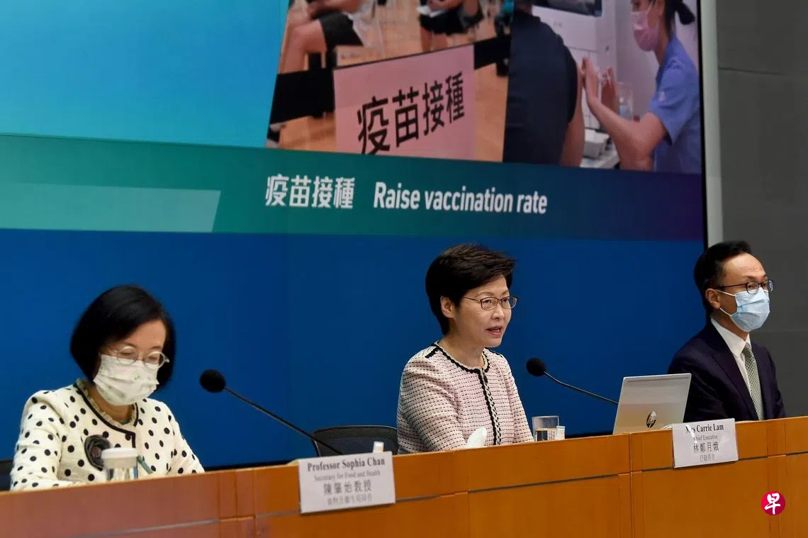 香港特区行政长官林郑月娥昨天宣布,香港公务员及政府员工、医院管理局员工、安老及残疾人士院舍员工、中、小、幼及特殊学校教职员,必须接种冠病疫苗,否则须自费定期接受冠病检测。图为林郑月娥(中)、港府公务员事务局局长聂德权(右)及食物及卫生局局长陈肇始(左)昨天出席记者会。(香港中通社)