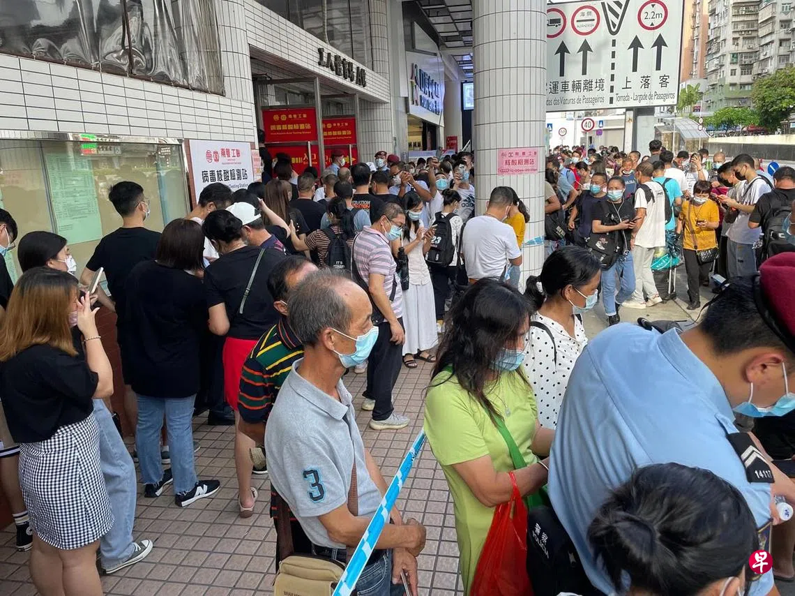 据珠海卫生部门通报,澳门一对夫妇前天在珠海采样的冠病检测结果为阳性。澳门特区政府随即为这对夫妇及同住的一对子女做核酸检测,初步结果呈阳性。澳门冠病感染应变协调中心随即宣布,自昨天下午3时30分起,离境需要24小时内核酸检测阴性报告,并呼吁澳门市民如非必要切勿离境。图为昨天下午,澳门大批居民及游客前往核酸监测站进行核酸检测。(中新社)