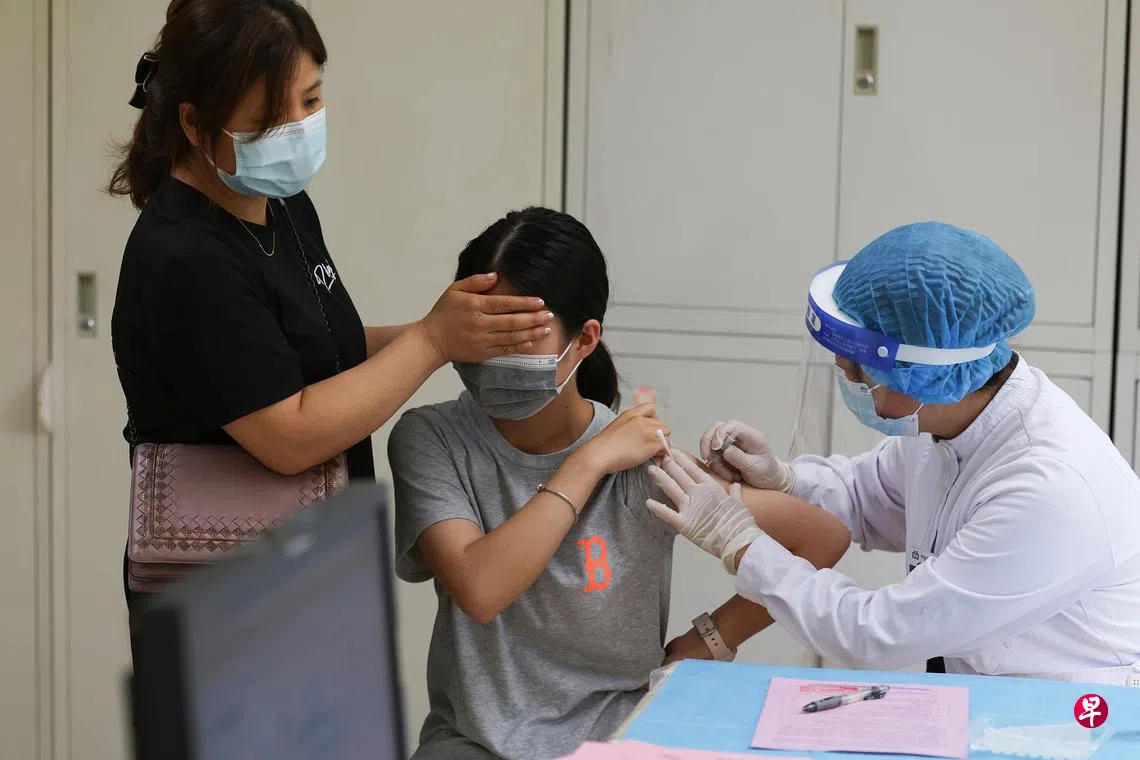 近日,北京、江苏、湖南、广东等地陆续启动12岁至17岁人群的冠病疫苗接种工作。北京市在7月20日全面启动12岁至17岁人群的冠病疫苗接种,使用包括国药中生北京所和北京科兴中维公司研制的冠病灭活疫苗。据中国国家卫健委的消息,截至8月3日,大陆31个省市累计报告接种冠病疫苗170835.6万剂次。图为昨天在北京市海淀区学院路街道的接种点内,一名青少年在家长的陪同下接种疫苗。(香港中通社)